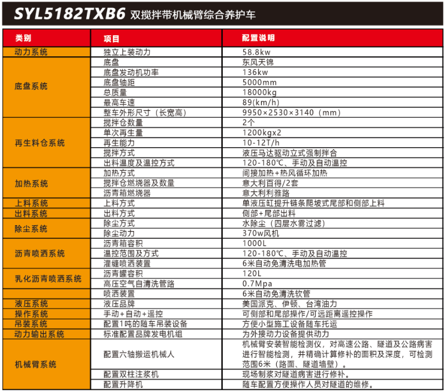 SYL5182TXB6 雙攪拌帶機(jī)械臂路面綜合養(yǎng)護(hù)車是一款集現(xiàn)場生產(chǎn)新瀝青混合料、瀝青路面冷料、舊料、銑刨料 100%現(xiàn)場加熱再生利用 ,熱瀝青灑布、裂紋跟蹤灌縫、乳化 瀝青噴灑、為其他裝置提供電力和液壓動力等多種功能于一體的瀝青路面熱再生綜合養(yǎng)護(hù)車。配置智能隧道檢測設(shè)備 ,一車多能 ,完成對公路、隧道病害? (坑槽、裂紋等)? 進(jìn)行智能檢測和快速修補(bǔ)??蓪崿F(xiàn)多場合、多路面的各種類養(yǎng)護(hù)作業(yè)。養(yǎng)護(hù)修補(bǔ)費(fèi)用低 ,作業(yè)快捷 ,高效率、節(jié)能環(huán)保性能突出等特點(diǎn)。適用于多種路況的中大施工量和高速公路中的隧道的檢測和修補(bǔ)施工。