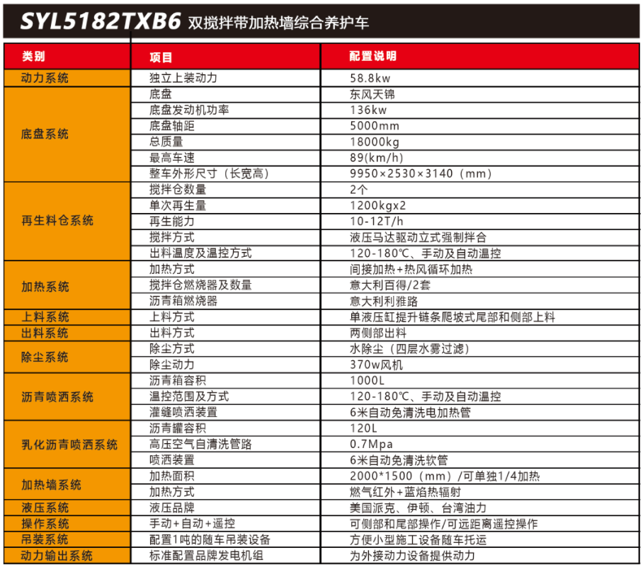 SYL5182TXB6 雙攪拌帶加熱墻路面綜合養(yǎng)護車是一款集現(xiàn)場生產新瀝青混合料、瀝 青路面冷料、? 舊料、銑刨料 100%現(xiàn)場加熱再生利用 ,熱瀝青灑布、裂紋跟蹤灌縫、乳化 瀝青噴灑、為其他裝置提供電力和液壓動力等多種功能于一體的瀝青路面熱再生綜合養(yǎng)護 車。配置智能燃氣紅外線加熱墻 ,可輕松對路面進行全方位加熱 ,可實現(xiàn)多場合、多路面 的各種類養(yǎng)護作業(yè)。養(yǎng)護修補費用低 ,作業(yè)快捷 ,高效率、節(jié)能環(huán)保性能突出等特點。主要適用于多種路況的中大施工量和高速公路的修補施工。