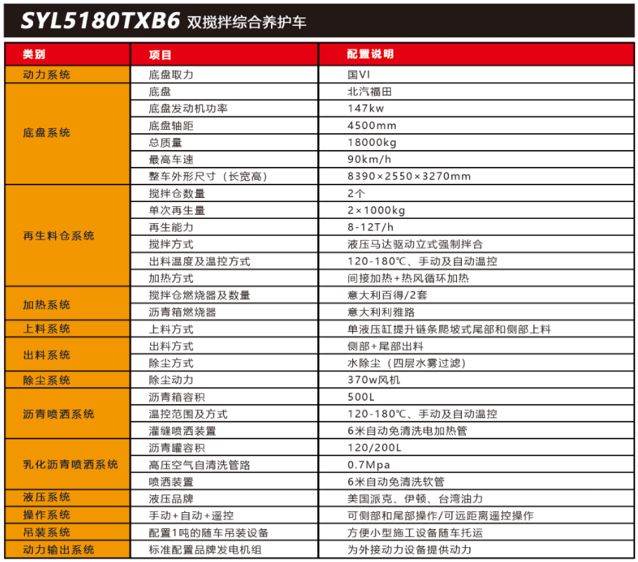 SYL5180TXB6 雙攪拌路面綜合養(yǎng)護(hù)車是一款集現(xiàn)場(chǎng)生產(chǎn)新瀝青混合料、瀝青路面冷 料、舊料、銑刨料 100%現(xiàn)場(chǎng)加熱再生利用,熱瀝青灑布、裂紋跟蹤灌縫、乳化瀝青噴灑、 為其他裝置提供電力和液壓動(dòng)力等多種功能于一體的瀝青路面熱再生綜合養(yǎng)護(hù)車??蓪?shí)現(xiàn) 多場(chǎng)合、多路面的各種類養(yǎng)護(hù)作業(yè) ,養(yǎng)護(hù)修補(bǔ)費(fèi)用低 ,作業(yè)快捷 ,高效率、節(jié)能環(huán)保性能突出等特點(diǎn)。適用于多種路況的中大施工量和高速公路的修補(bǔ)施工。